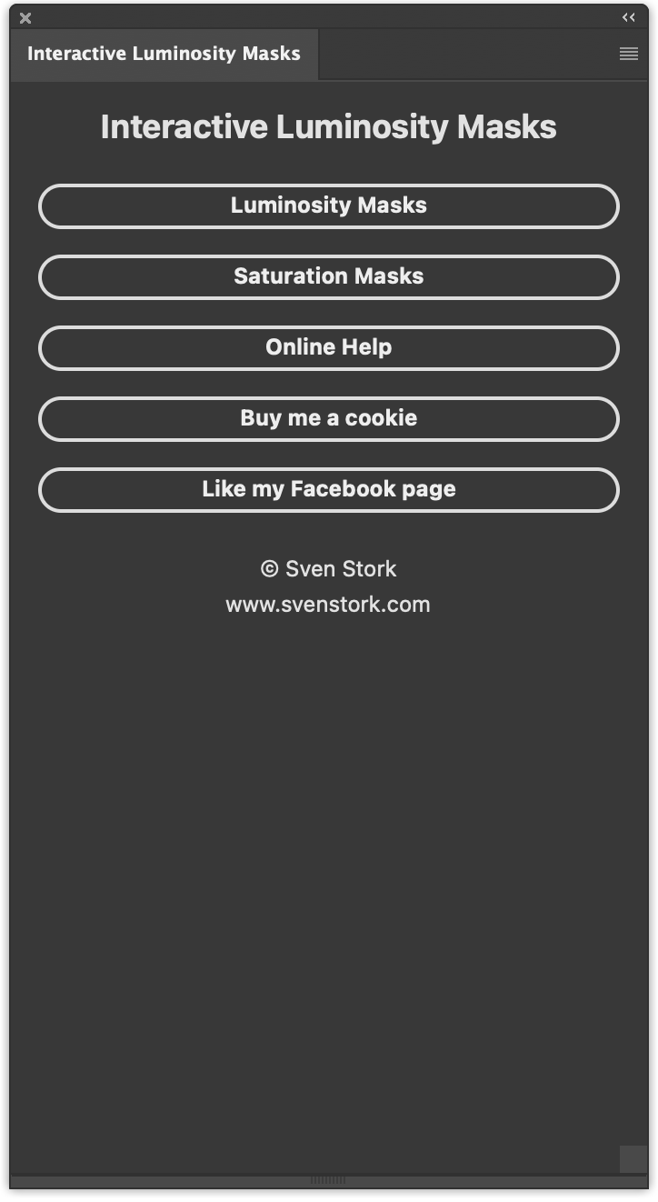 After you successfully install the panel, you can open it via Plugins > Interactive Luminosity > Interactive Luminosity Masks. When the panel window opens, it will show the main menu dialog: